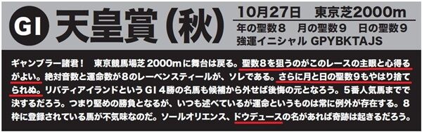 ★天皇賞(秋)「聖数8を狙う」=1着ドウデュースは運命数8!「月と日の聖数9もやはり捨てられぬ」=3着ホウオウビスケッツは馬番9で子音数9!「ドウデュース」=同馬は1着!