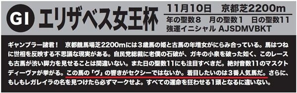 ★エリザベス女王杯「絶対音数暗示は必須」=1着スタニングローズは絶対音数8!「1、8、10、11、17番」=1着スタニングローズは11番、3着ホールネスは1番!
